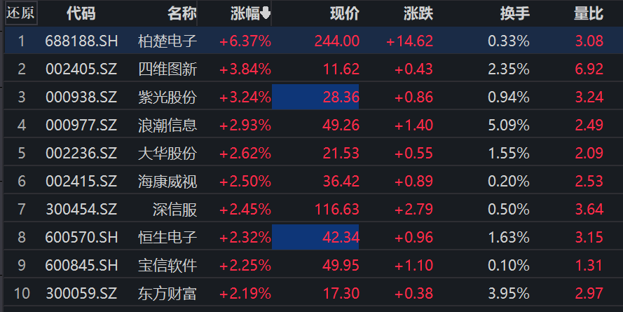 涨幅方面,柏楚电子涨超6%,四维图新、紫光股份涨超3%,浪潮信息、大华股份、海康威视、深信服等均涨超2%。