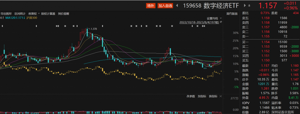 跟踪该指数的数字经济ETF(159658)走高,现涨0.96%,成交额突破1200万元,换手率3.58%,交投活跃。