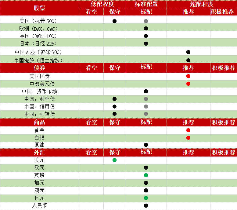 2023年中国银行投资策略研究中心大类资产配置一览