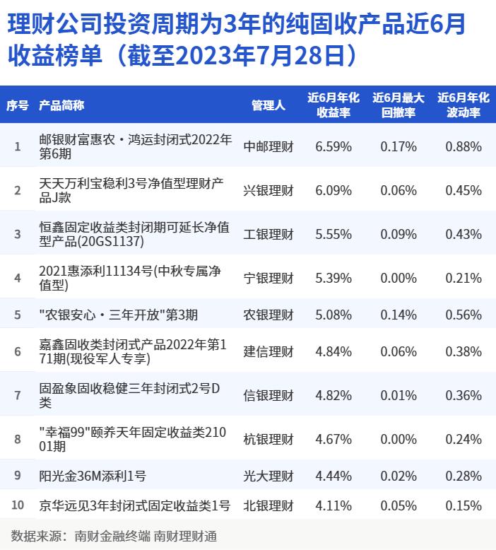 根据南财理财通数据,截至7月28日,理财公司投资周期为3年的纯固收产品近6月收益榜单中,共有10家理财公司上榜,分别为中邮理财、兴银理财、工银理财、宁银理财、农银理财、建信理财、信银理财、杭银理财、光大理财和北银理财,各家理财公司均上榜1只产品。