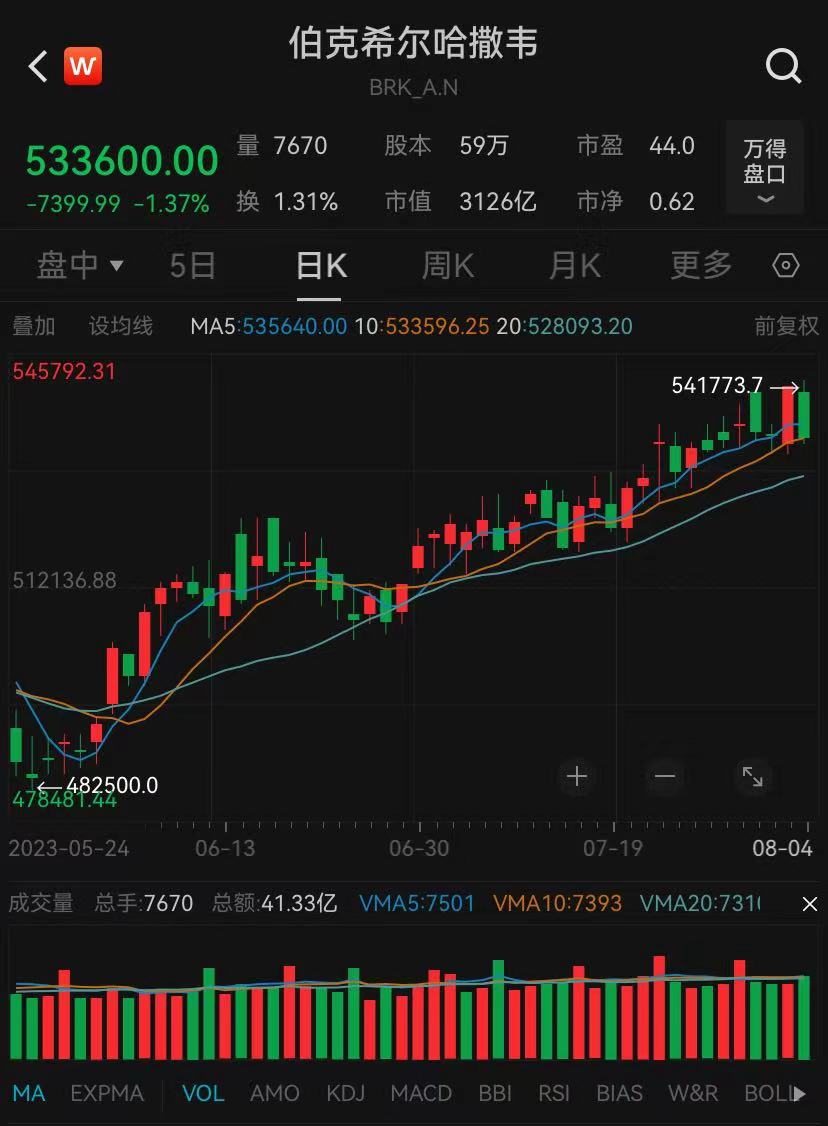 8月4日周五,伯克希尔哈撒韦A(BRK.A.N)收跌1.4%,重回7月28日以来的一周低位,今年累涨近14%。