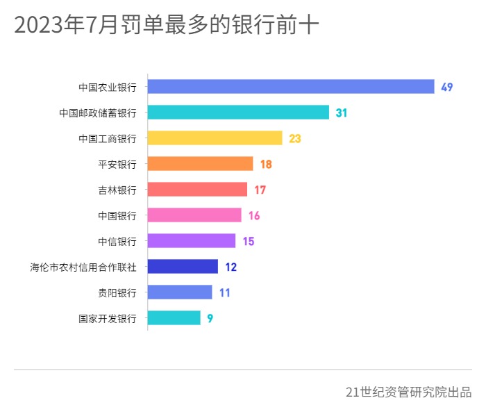 7月领罚单最多的银行为农业银行,罚单数量49,邮储银行、工行分别排第二、第三。