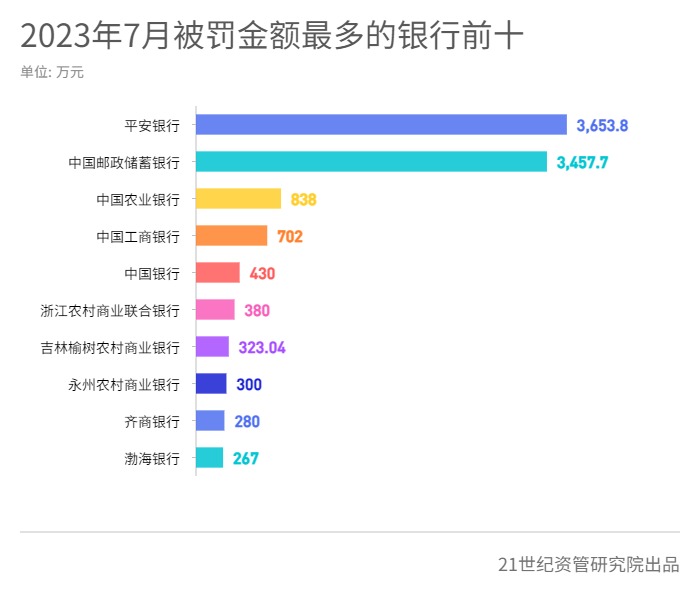 7月被罚金额最多的银行是平安银行,合计被罚金额达3653.8万,邮政储蓄银行以3457.7万元排第二,农业银行以838万元排第三。邮储银行和农业银行无论罚单数量还是处罚金额均居前三。