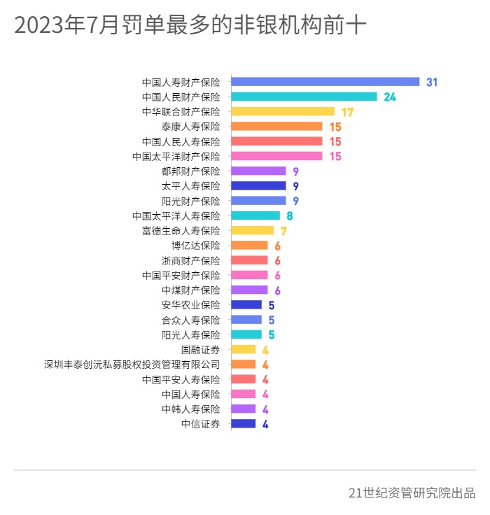 非银处罚排行榜显示,中国人寿财产保险、中国人民财产保险的罚单数量和处罚金额居前二,为7月受罚力度较大的非银机构。