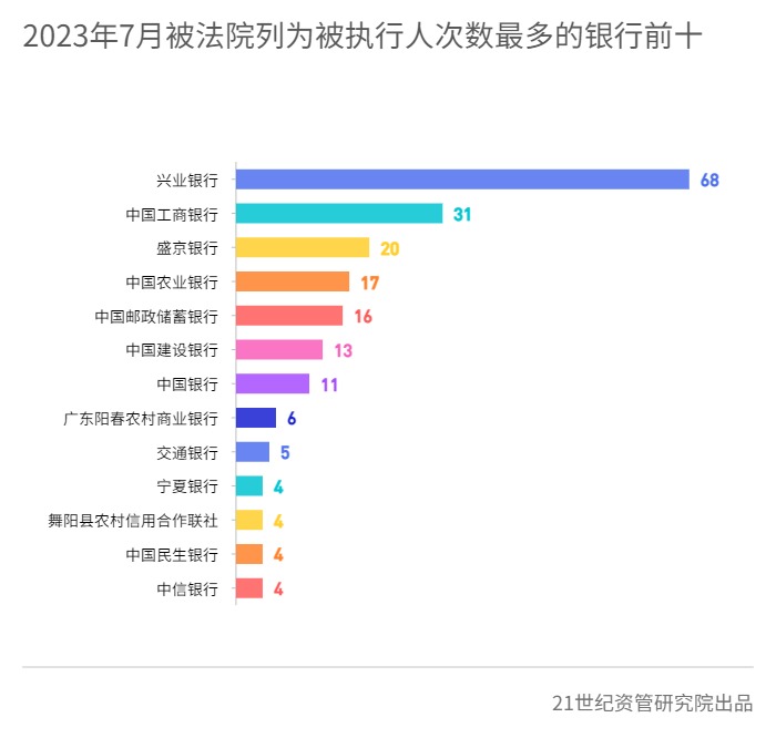 7月被法院列为被执行人次数最多的银行为兴业银行,有多达68条被执行人信息。排第二、第三的银行分别为工商银行、盛京银行。盛京银行今年以来频频被列为被执行人,经常被法院列为被执行人的次数居前。