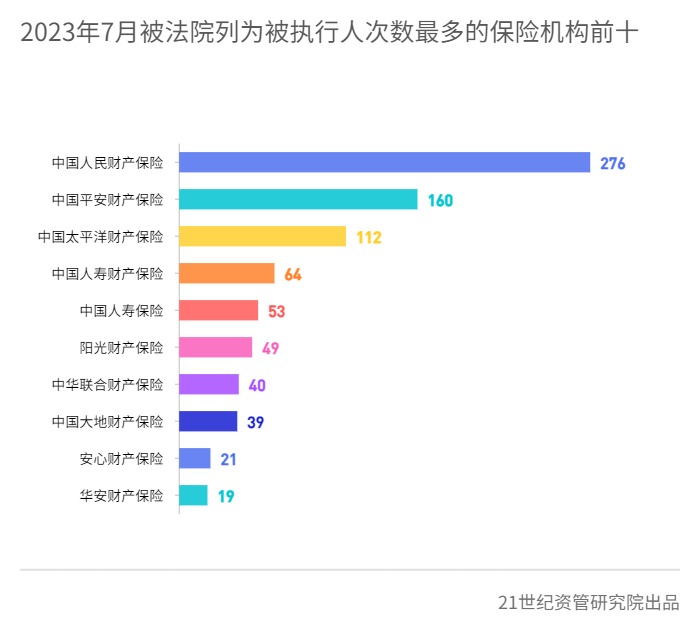 7月被法院列为被执行人次数最多的银行为保险机构为中国人民财产保险,其次是中国平安财产保险、中国太平洋财产保险。