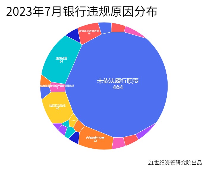 从7月银行违规原因分布来看,被罚较多的违规原因有未依法履行职责、违规经营、违反反洗钱法等。