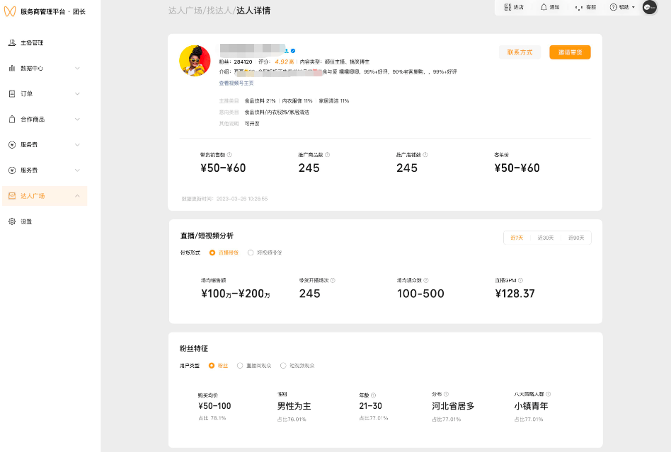 和抖音的“巨量星图”类似,团长可以在达人广场上查看达人的详细资料,包括带货类目、带货数据、达人属性、粉丝数据等。找到合适的达人后,团长可以在该页面直接获取达人联系方式,或点击“邀请带货”按钮发起邀约合作。