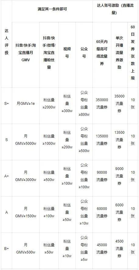 上个月,视频号针对抖音、快手、淘宝等的达人发布了《视频号电商直播达人冷启动激励计划》,符合条件的优质达人能够得到丰厚的流量扶持,最高级别的S+达人60天内最高可得35万流量券,B+级别达人60天内最高可得4.5万流量券。