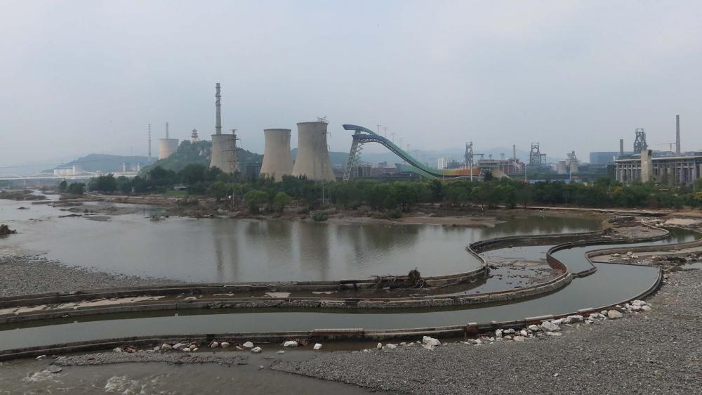 2023年8月8日,北京,新首钢大桥下的洪水消退后现状。从7月31日开始的2023年北京永定河一号洪水一周后渐渐消退,新首钢大桥下的北京冬奥公园慢慢露出原貌,待重建恢复。(IC)