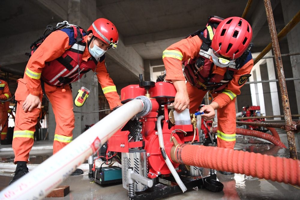 8月7日,邢台市消防救援支队队员在河北省涿州市一处工地进行排涝作业。新华社记者朱旭东 摄