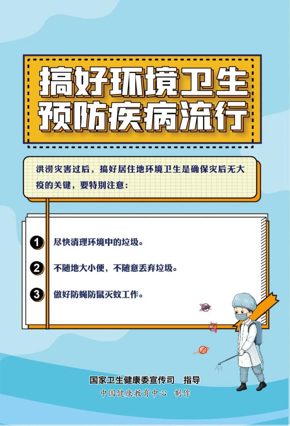 近日多地出现洪涝灾害,提醒广大公众洪涝灾害期间做好饮食卫生,保持卫生习惯,灾害过后注意环境卫生,预防疾病发生。