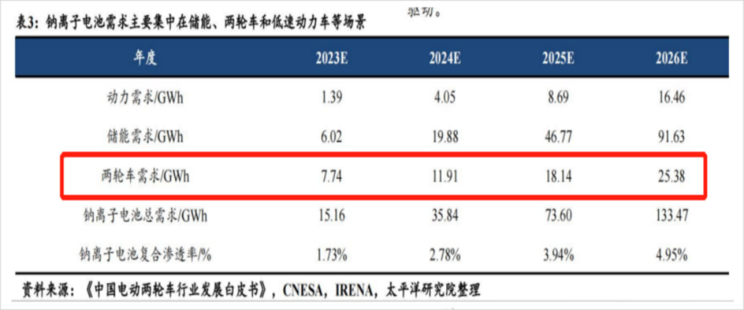 《中国电动两轮车行业发展白皮书》给出的预测是,2023年为钠电产业化元年,有望实现小批量出货,两轮车需求有望达到7.74GWh,2024年实现大批量量产,规模有望达到10GWh以上,换算成出货量的话,则在千万台以上,渗透率超20%。