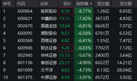 其中,哈投股份跌超8%,华鑫股份跌超7%,国盛金控、湘财股份、西南证券、财达证券跌超6%。