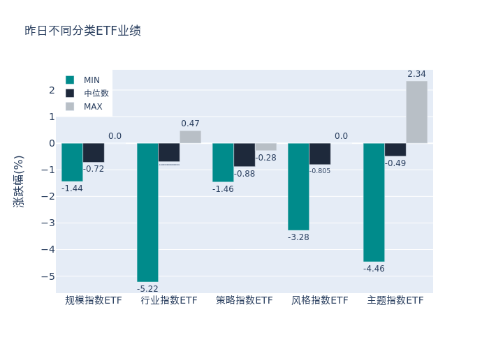 昨日股票型ETF收益率中位数为-0.66%。其中按照不同分类,规模指数中景顺长城纳斯达克科技ETF(QDII)收益率最高,为0.0%;行业指数中博时中证全指电力公用事业ETF收益率最高,为0.47%;策略指数中平安富时中国国企开放共赢ETF收益率最高,为-0.28%;风格指数中华夏中证智选300价值稳健策略ETF收益率最高,为0.0%;主题指数中华夏中证动漫游戏ETF收益率最高,为2.34%。