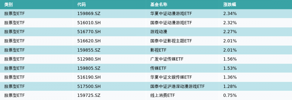 昨日股票型ETF涨幅最高的3支ETF及其收益率分别为:华夏中证动漫游戏ETF(2.34%)、国泰中证动漫游戏ETF(2.32%)、游戏动漫(2.27%)。涨幅前10详情见下表: