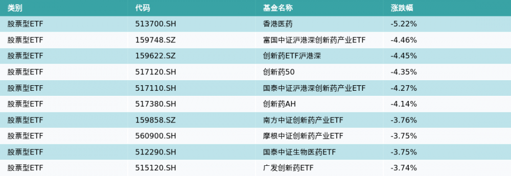 昨日股票型ETF跌幅最大的3支ETF及其收益率分别为:香港医药(-5.22%)、富国中证沪港深创新药产业ETF(-4.46%)、创新药ETF沪港深(-4.45%)。跌幅前10详情见下表: