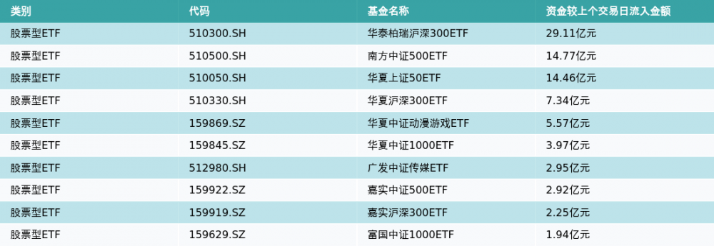 昨日股票型ETF资金流入最多的3支ETF及其流入金额分别为:华泰柏瑞沪深300ETF(流入29.11亿元)、南方中证500ETF(流入14.77亿元)、华夏上证50ETF(流入14.46亿元)。资金流入前10详情见下表: