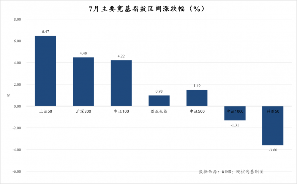 对应的,市场主要宽基指数中,上证50和沪深300指数在7月分别以6.47%和4.48%的涨幅领涨。