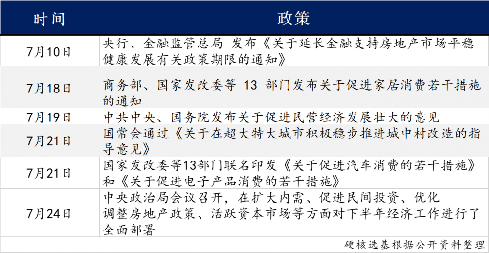 的确如此,自7月10号央行和金融监管总局发布《关于延长金融支持房地产市场平稳健康发展有关政策期限的通知》到7月24日中央政治局会议召开,对下半年经济工作进行全面部署,重磅政策的陆续出台与7月初市场的博弈方向一致,加速了顺周期的行情。