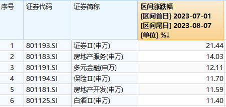 板块表现上,截至8月7日收盘,申万证券、房地产服务、多元金融、保险、房地产开发等指数7月以来大涨超11%,其中证券指数以21.44%的涨幅大幅领跑。非银金融和地产板块的领涨带动了大盘风格的走强。