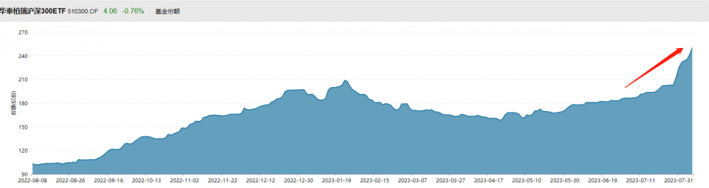 8月以来的5个交易日里内,华泰柏瑞沪深300ETF基金规模仍稳步增长,截至8月7日收盘最新规模已超千亿,达1015.61亿元,也是目前国内规模最大的一只股票型ETF。