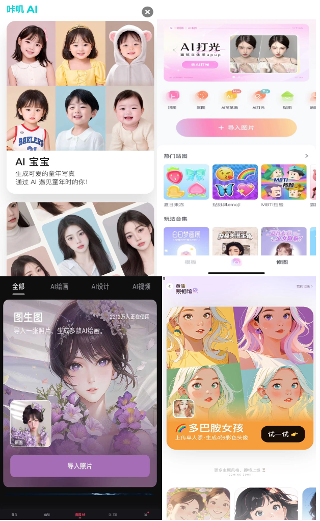 美颜照相赛道的老牌公司也按捺不住,光速上新,B612上线“咔叽AI”选项,支持用户在线生成童年照、证件照、宠物写真照;美图秀秀推出“AI绘画、AI设计、AI视频”等功能;一甜相机上线“AI打光”图片编辑功能,黄油相机上线AI头像制作功能等等。