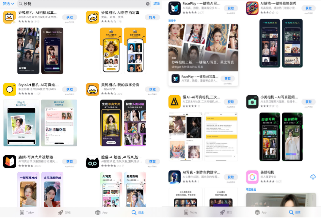一石激起千层浪,仿佛只是一夜间,千千万万个“妙鸭”冒出来了。光锥智能在苹果应用商店里搜索妙鸭时,就出现了“美鸭”、“StyleArt相机”、“脸猫”等五花八门的产品。