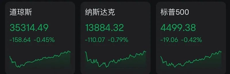 当地时间周二,美股再度挣扎,三大指数集体收跌。截至收盘,道指跌158.64点,跌幅为0.45%,报35314.49点;标普500指数跌19.06点,跌幅为0.42%,报4499.38点;纳指跌110.07点,跌幅为0.79%,报13884.32点。