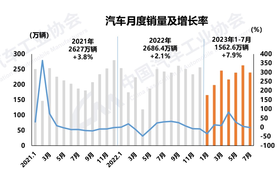 当天,中汽协发布的2023年7月中国汽车市场产销数据显示,7月,汽车产销分别完成240.1万辆和238.7万辆,同比分别下降2.2%和1.4%。1-7月,汽车产销分别完成1565万辆和1562.6万辆,同比分别增长7.4%和7.9%,累计产销增速较1-6月均回落1.9个百分点。