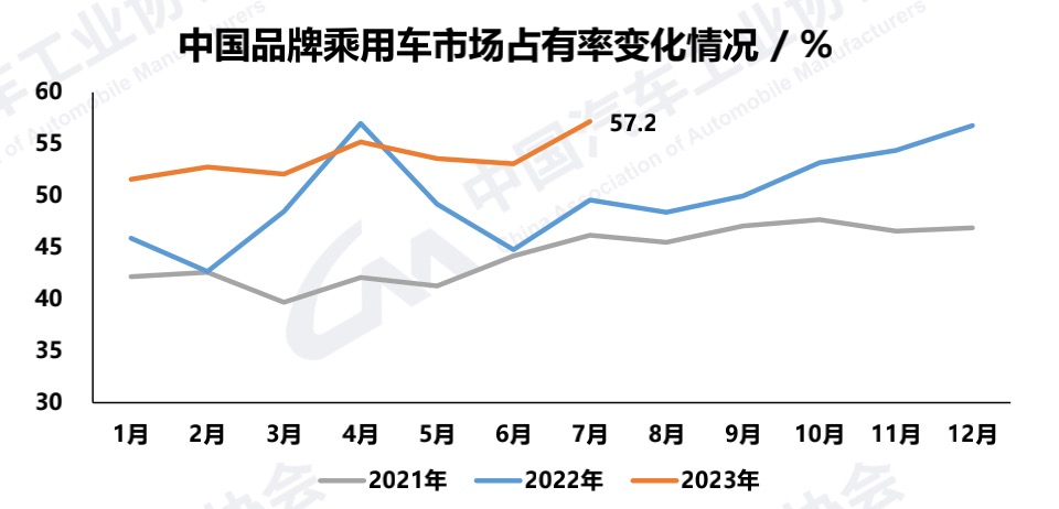 7月,中国品牌乘用车的市场份额达到了57.2%,创下年内新高,较去年同期上升7.6个百分点。