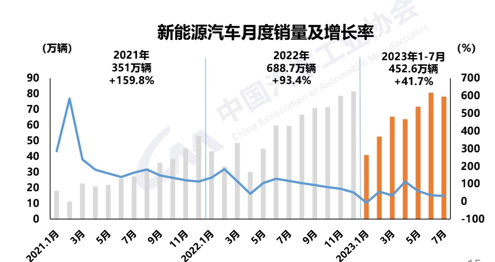 7月,新能源汽车产销分别完成80.5万辆和78万辆,同比分别增长30.6%和31.6%,市场占有率达到32.7%。前7月,新能源汽车产销分别完成459.1万辆和452.6万辆,同比分别增长40%和41.7%,市场占有率达到29%。