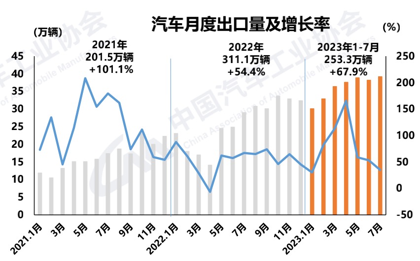 7月,新能源汽车国内销量67.9万辆,同比增速为26%,而新能源汽车出口10.1万辆,同比增长了87%。前7月,新能源汽车出口63.6万辆,同比增长1.5倍。