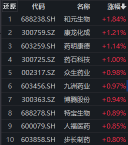 A股三大指数早盘集体下跌,医药板块逆势走高。截至发稿,相关指数中,中证创新药产业指数(931152)小幅上涨,成分股多数飘红。其中和元生物涨近2%,康龙化成、药明康德涨超1%,药石科技、众生药业、九洲药业、博腾股份等跟涨。