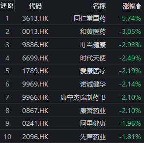 港股方面,医疗医药股多数下跌。截至发稿,相关指数中,中证港股通医药卫生综合指数 (930965) 跌近1%。截至发稿,成分股中,同仁堂国药跌近6%,和黄医药跌超3%,叮当健康、时代天使、爱康医疗、诺诚健华、康宁杰瑞制药-B、康哲药业跌逾2%。