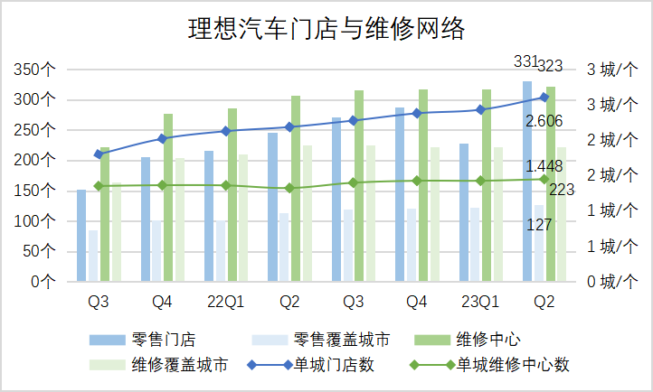 截至今年二季度,理想在全国127个城市中有331个零售门店,平均每个城市拥有2.6个销售终端。而维修服务网络方面,尽管在223个城市中拥有323个维修中心,但每城维修中心不到一个半。