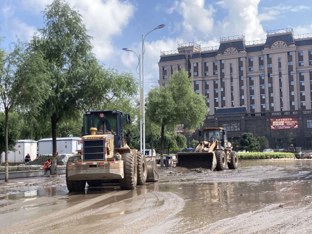 8月9日下午,在尚志市东浦新区一座公园附近的道路上,洪水退去后的清淤工作正在进行。新华社记者金地 摄
