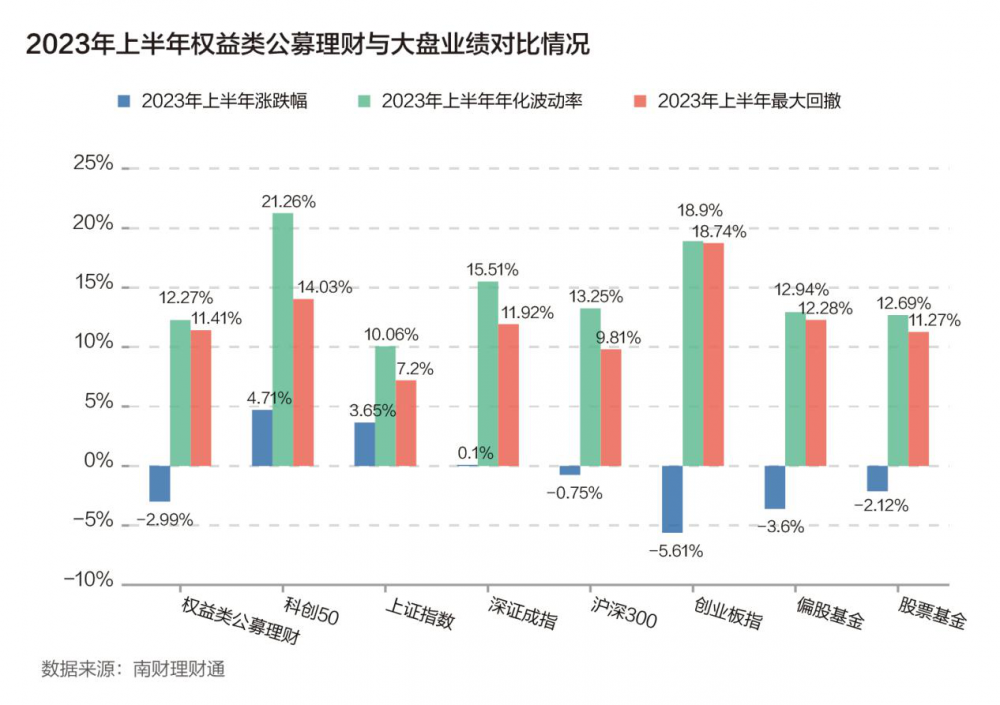 据南财理财通数据,2023年上半年,理财公司共发行了24只权益类产品,同比2022年上半年的46只下降了47.83%,减少了近五成,市场资金避险情绪升温。