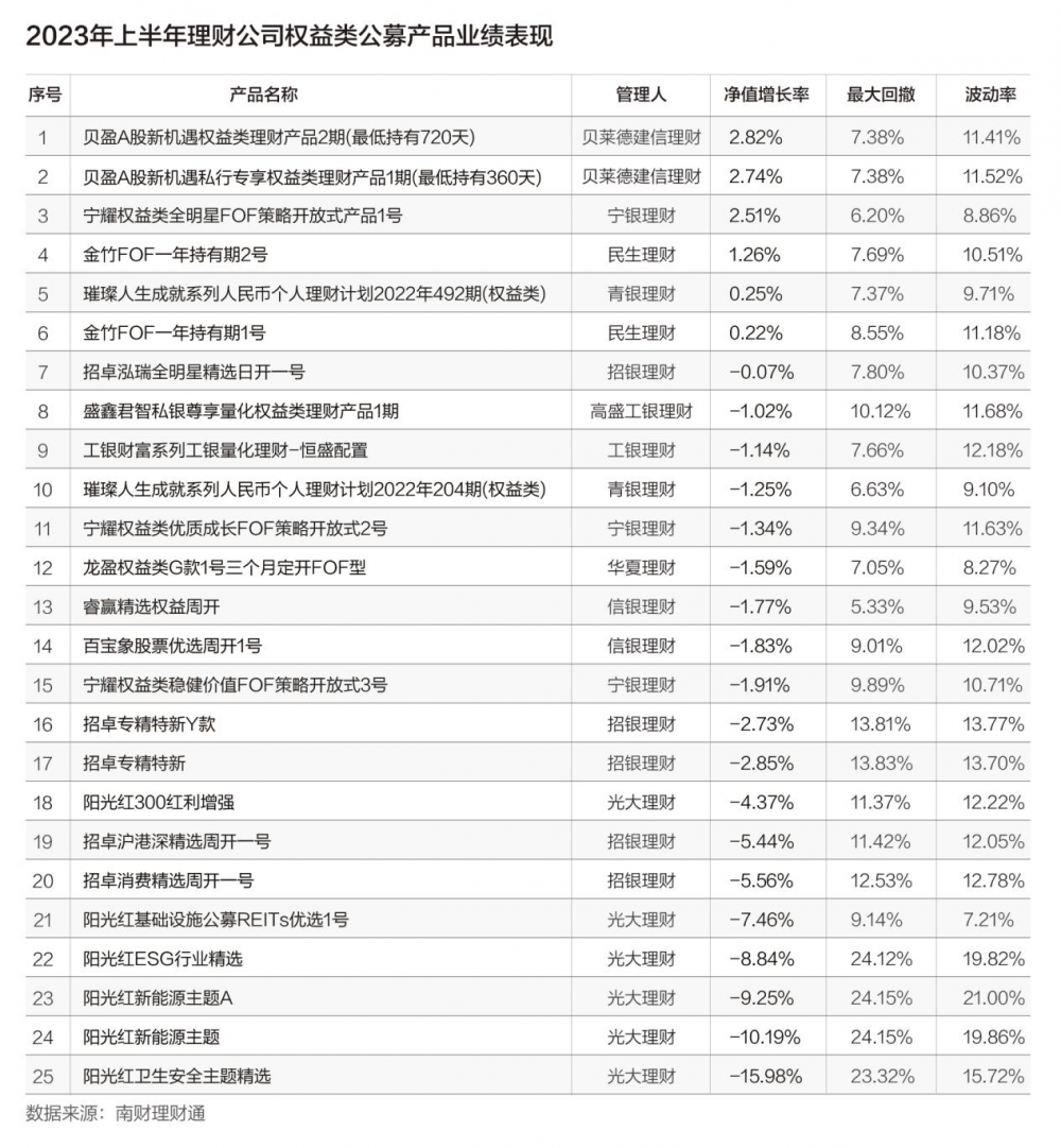 南财理财通数据显示,25只权益类公募理财产品中有6只上半年业绩录得正收益。其中,合资理财公司贝莱德建信理财的两款产品包揽前两名,上半年净值增长率分别为2.82%和2.74%。