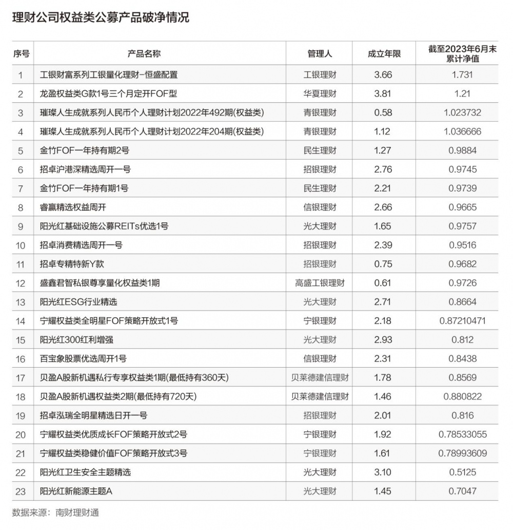 从破净情况看,仅有工银理财的“工银量化理财-恒盛配置”、华夏理财的“龙盈权益类G款1号三个月定开FOF型”以及青银理财的两款权益类公募产品净值大于0,其余产品仍处于“破净”行列。宁银理财的“权益类优质成长FOF”和“权益类稳健价值FOF”、光大理财的“卫生安全主题精选”和“新能源主题A”净值均低于0.8,成立以来跌幅已超过20%。