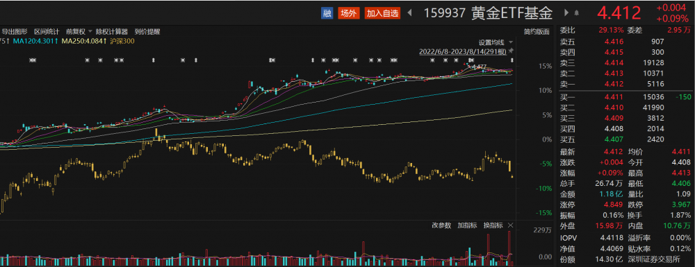 ETF方面,今日(8月14日)黄金ETF基金(159937)小幅走高,截至午间收盘,涨0.14%,成交额超1亿元。