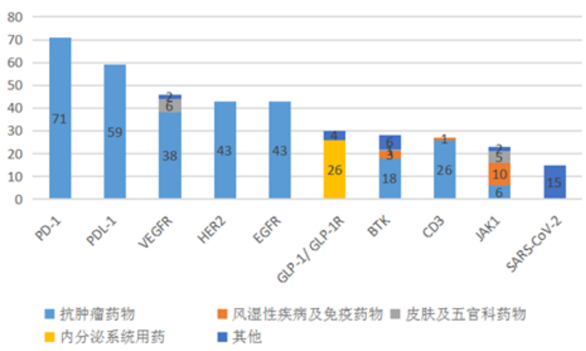 另据2022年6月CDE发布的《中国新药注册临床试验进展年度报告(2021年)》,按药物品种统计,2021年登记临床试验的前10位靶点分别为PD-1、PD-L1、VEGFR、HER2等,品种数量分别多达71个、59个、46个、43个,其中5个靶点(PD-1、PD-L1、HER2、EGFR和CD3)的药物适应症超过90%集中在抗肿瘤领域,4个靶点(PD-1、PD-L1、HER2和EGFR)的药物适应症全部集中在抗肿瘤领域。