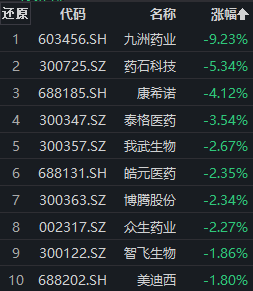 医药板块早盘走低。截至发稿,相关指数中,中证创新药产业指数(931152)下跌超1%,成分股跌多涨少。其中九洲药业跌超9%,药石科技跌逾5%,康希诺、泰格医药、我武生物、皓元医药、博腾股份、众生药业、智飞生物等跟跌。