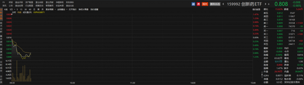跟踪该指数的ETF中规模最大的创新药ETF(159992)早盘下跌,但盘中频现溢价。截至发稿,该ETF跌幅为0.98%,溢折率为0.11%,成交金额超5300万元。