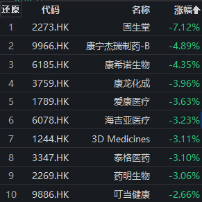 港股方面,医疗医药股同样多数下跌。截至发稿,相关指数中,中证港股通医药卫生综合指数 (930965) 跌超1%。成分股中,固生堂跌超7%,康宁杰瑞制药-B、康希诺生物跌超4%,康龙化成、爱康医疗、海吉亚医疗、3D Medicines、药明生物跌逾3%。
