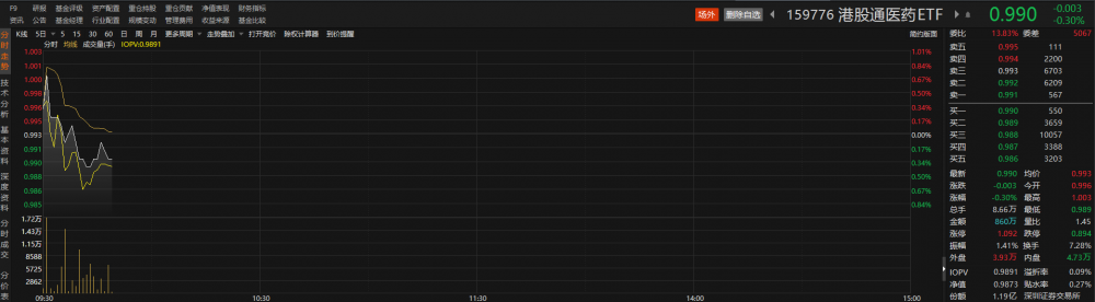 跟踪该指数的港股通医药ETF(159776)早盘高开后小幅回落,但盘中持续溢价交易。截至发稿,该ETF跌幅为0.30%,溢折率为0.09%。