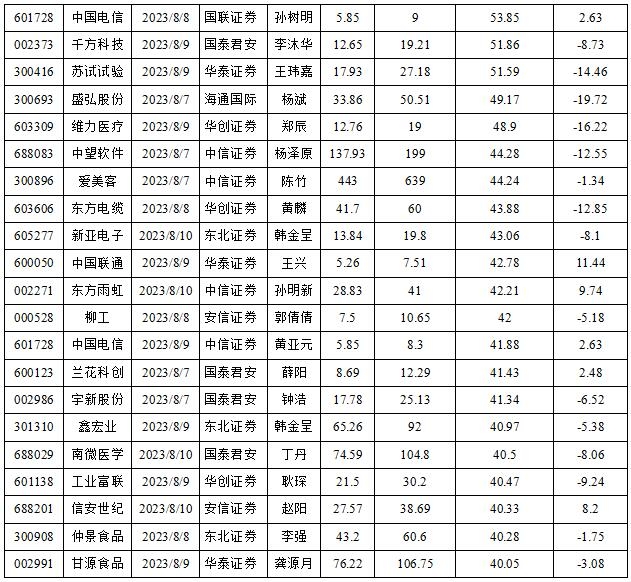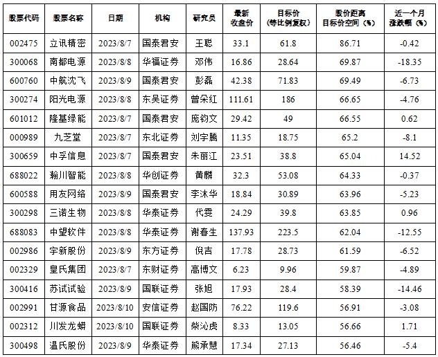 距收盘价空间最大的是立讯精密。国泰君安研究员王聪在8月7日发表的题为《立讯精密:MR产品领先布局,汽车与通讯业务高速发展》的报告中指出,公司通讯与汽车业务发展迅速,中长期成长空间广阔。同时公司消费电子业务迎来收获期,深度布局ARVRMR产品,未来将深度受益于产品放量。参照行业平均估值水平并考虑公司的行业龙头地位,给予其目标价至61.8元。按公司周五收盘价33.1元计算,股价还有86.71%的向上空间。