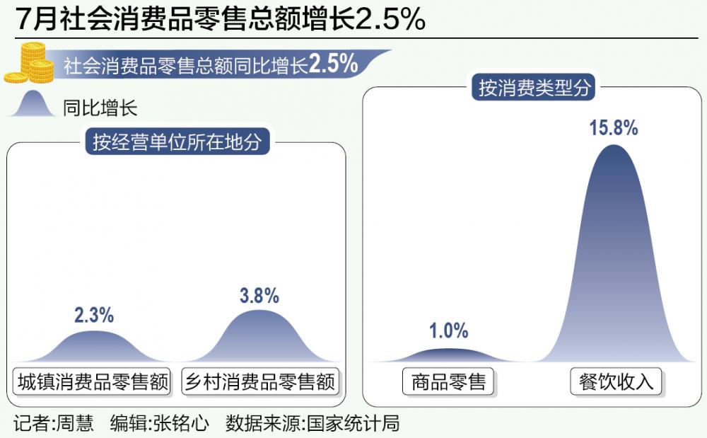 8月15日,国家统计局发布7月份经济数据。其中,7月份社会消费品零售总额36761亿元,同比增长2.5%,环比下降0.06%。