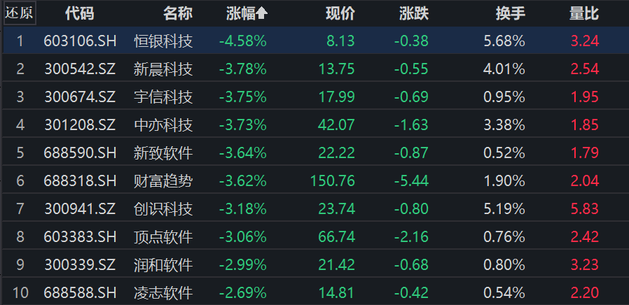 计算机、非银金融成分股行业权重超95%的中证金融科技主题指数低开低走,成分股普跌,截至发稿,恒银科技跌超4%,新晨科技、宇信科技、中亦科技、新致软件、财富趋势、创识科技、顶点软件均跌超3%。