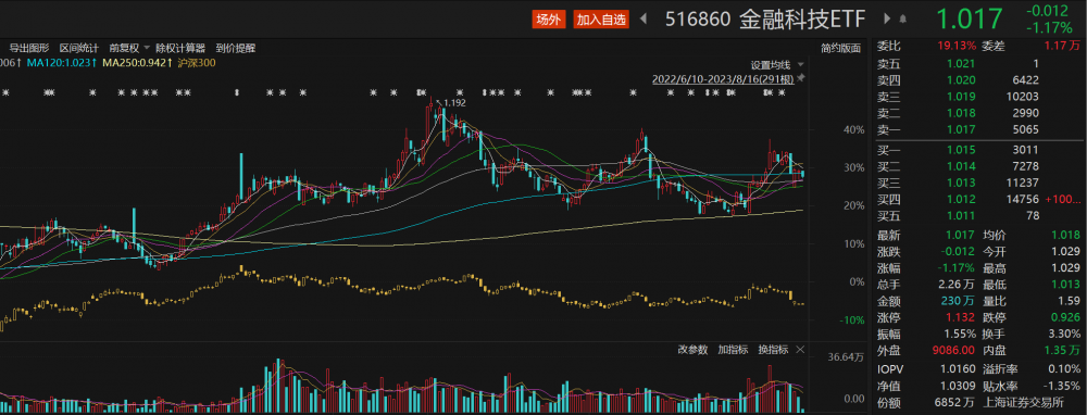 受行情影响,金融科技ETF(516860)开盘下挫,截至发稿,该ETF跌1.17%,盘中频现溢价,值得一提的是,该ETF近两个交易日主力资金呈净流入。